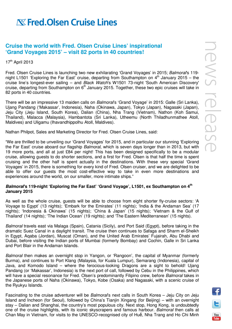 Fred. Olsen Cruise Lines is launching two new exhilarating ‘Grand Voyages’ in 2015; Balmoral's 119-night L1501 ‘Exploring the Far East’ cruise, departing from Southampton on 4th January 2015 – the cruise line’s longest-ever sailing – and Black Watch's W1501 73-night 'South American Discovery' cruise, departing from Southampton on 6th January 2015.
