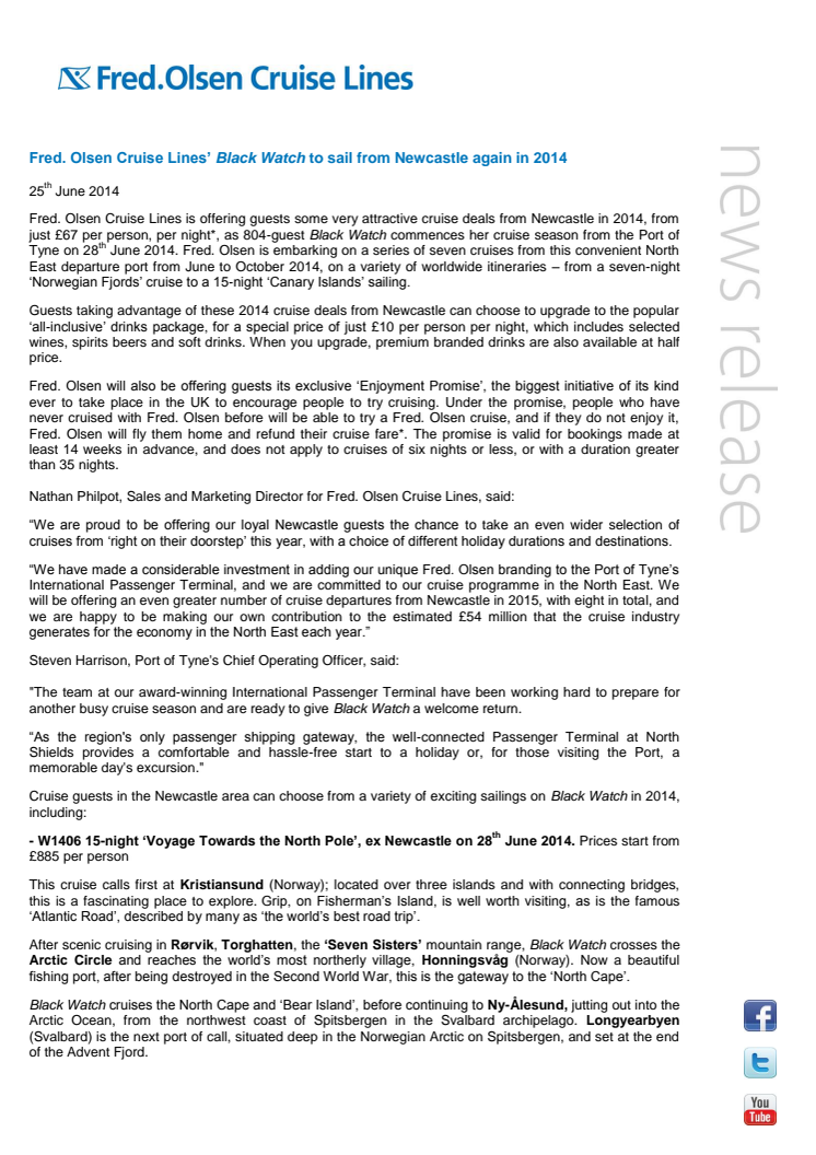Fred. Olsen Cruise Lines is offering guests some very attractive cruise deals from Newcastle in 2014, from just £67 per person, per night*, as 804-guest Black Watch commences her cruise season from the Port of Tyne on 28th June 2014. Fred. Olsen is embarking on a series of seven cruises from this convenient North East departure port from June to October 2014, on a variety of worldwide itineraries.