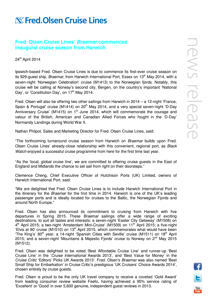 Ipswich-based Fred. Olsen Cruise Lines is due to commence its first-ever cruise season on its 929-guest ship, Braemar, from Harwich International Port, Essex on 13th May 2014, with a seven-night ‘Norwegian Celebration’ cruise (M1413) to the Norwegian fjords. Notably, this cruise will be calling at Norway’s second city, Bergen, on the country’s important ‘National Day’ on 17th May 2014.