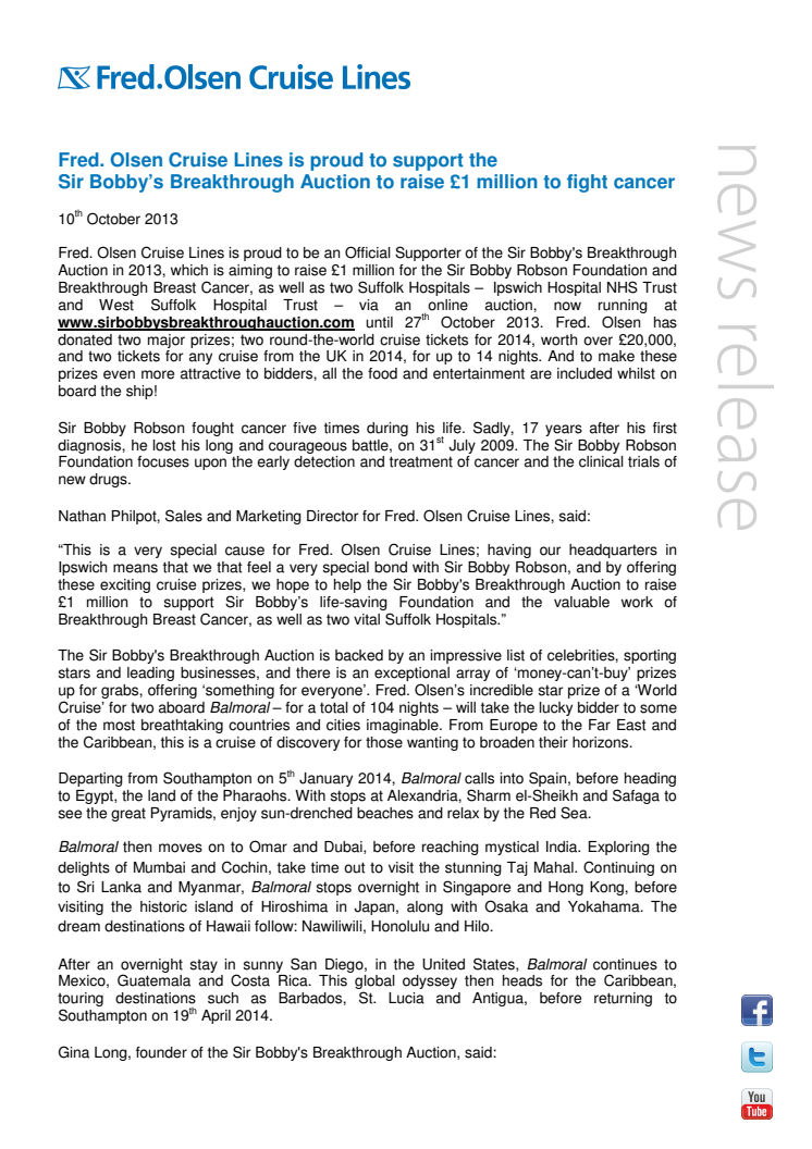 Fred. Olsen Cruise Lines is proud to be an Official Supporter of the Sir Bobby's Breakthrough Auction in 2013, which is aiming to raise £1 million for the Sir Bobby Robson Foundation and Breakthrough Breast Cancer, as well as two Suffolk Hospitals – Ipswich Hospital NHS Trust and West Suffolk Hospital Trust