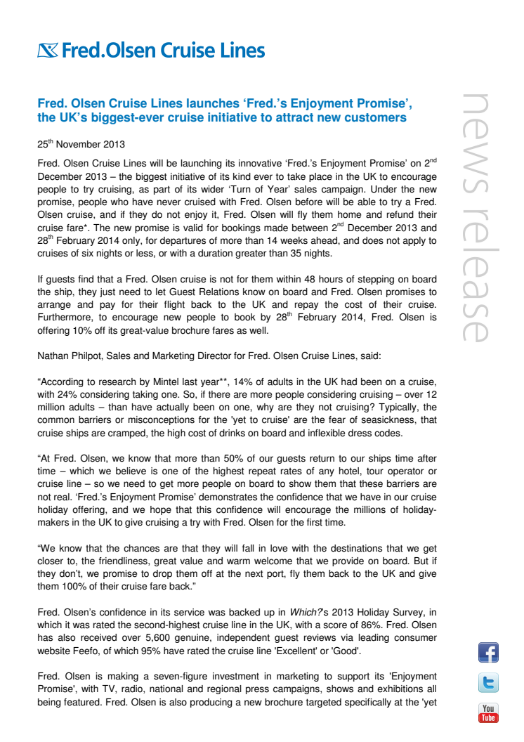 Fred. Olsen Cruise Lines will be launching its innovative ‘Fred.’s Enjoyment Promise’ on 2nd December 2013 – the biggest initiative of its kind ever to take place in the UK to encourage people to try cruising, as part of its wider ‘Turn of Year’ sales campaign.