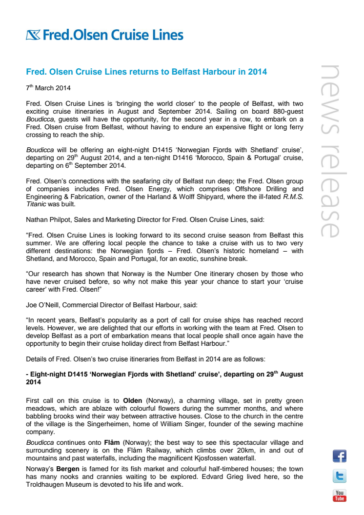 Fred. Olsen Cruise Lines is ‘bringing the world closer’ to the people of Belfast, with two exciting cruise itineraries in August and September 2014. Sailing on board 880-guest Boudicca, guests will have the opportunity, for the second year in a row, to embark on Fred. Olsen cruises from Belfast, without having to endure an expensive flight or long ferry crossing to reach the ship.