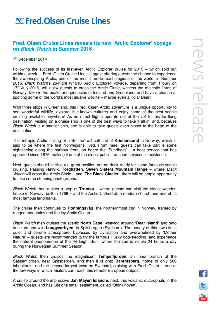 Following the success of its first-ever 'Arctic Explorer' cruise for 2015 – which sold out within a week! – Fred. Olsen Cruise Lines is again offering guests the chance to experience the awe-inspiring Arctic, one of the most hard-to-reach regions of the world, in Summer 2016. Black Watch's 26-night W1610 ‘Arctic Explorer’ voyage, departing from Tilbury.