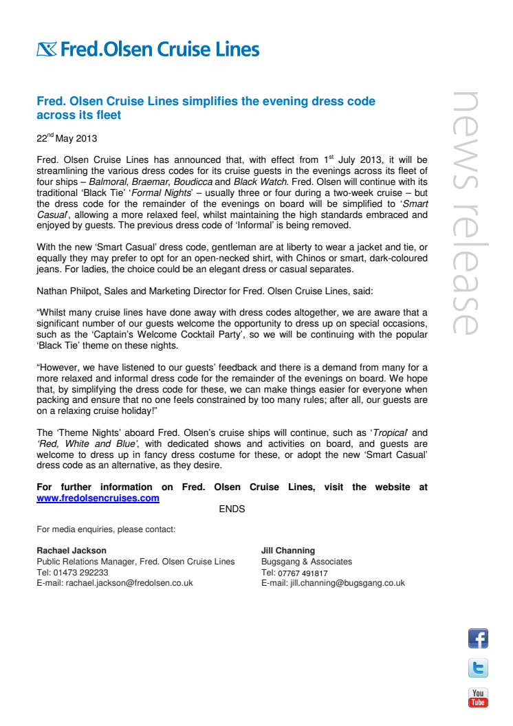 Fred. Olsen Cruise Lines has announced that, with effect from 1st July 2013, it will be streamlining the various dress codes for its cruise guests in the evenings across its fleet of four ships.