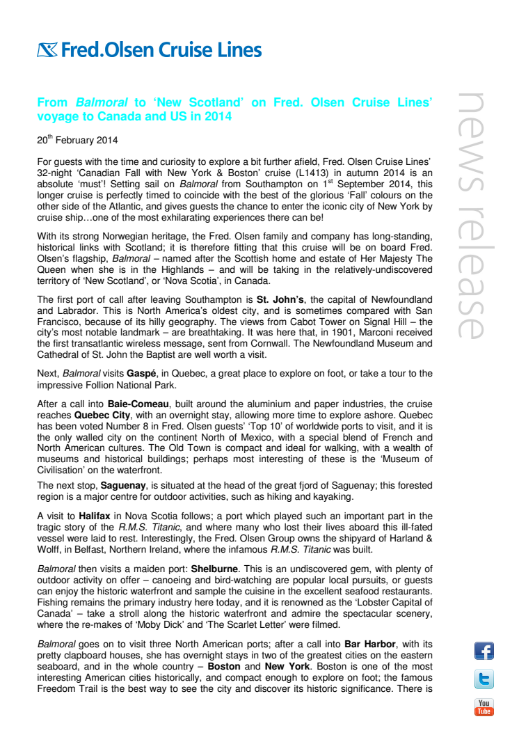 32-night ‘Canadian Fall with New York & Boston’ cruise (L1413) in autumn 2014 is an absolute ‘must’! Setting sail on Balmoral from Southampton on 1st September 2014, this longer cruise is perfectly timed to coincide with the best of the glorious ‘Fall’ colours on the other side of the Atlantic, and..