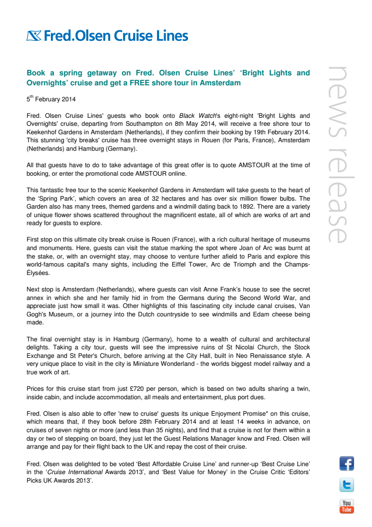 Fred. Olsen Cruise Lines' guests who book onto Black Watch's 8-night 'Bright Lights and Overnights' cruise, departing from Southampton on 8th May 2014, will receive a free shore tour to Keekenhof Gardens in Amsterdam (Netherlands), if they confirm their booking by 19th February 2014. This stunning 'city breaks' cruise has three overnight stays in Rouen (for Paris, France), Amsterdam and Hamburg.