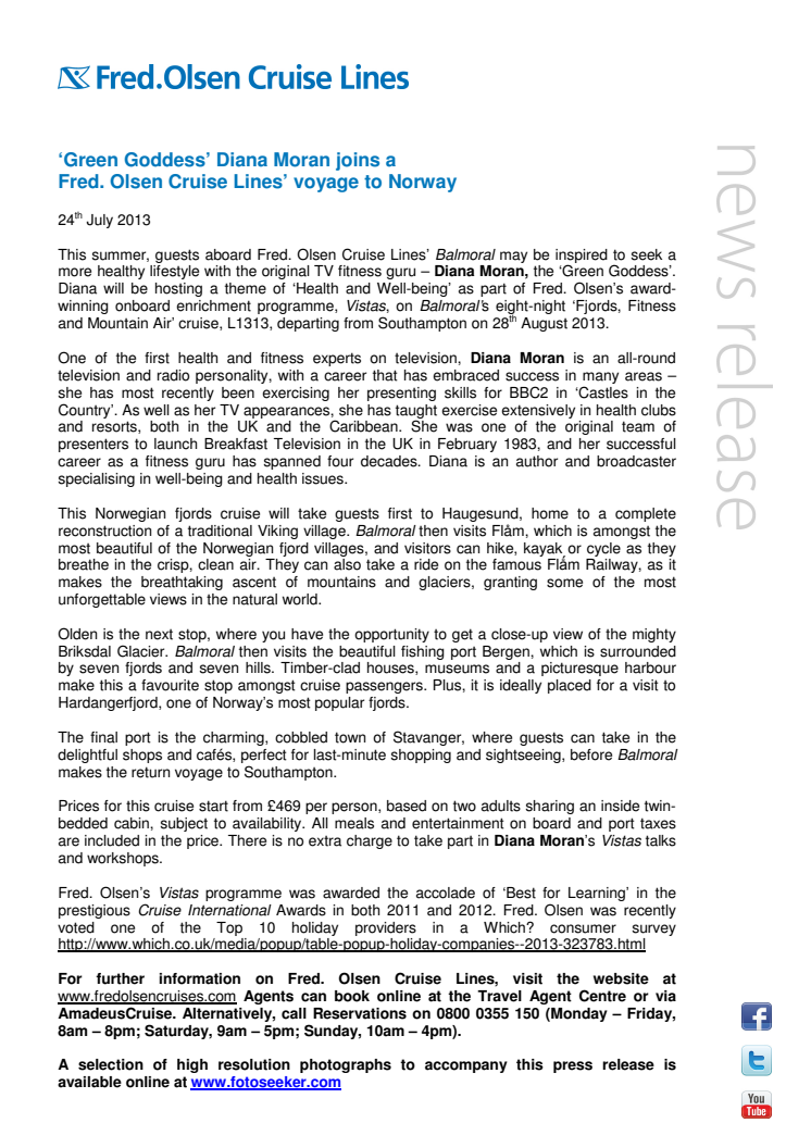 This summer, guests aboard Fred. Olsen Cruise Lines’ Balmoral may be inspired to seek a more healthy lifestyle with the original TV fitness guru – Diana Moran, the ‘Green Goddess’.
