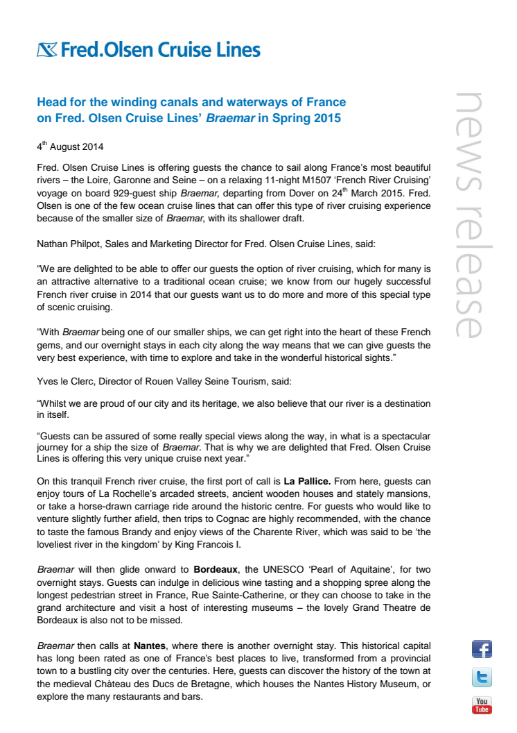 Fred. Olsen Cruise Lines is offering guests the chance to sail along France’s most beautiful rivers – the Loire, Garonne & Seine – on a relaxing 11-night M1507 ‘French River Cruising’ voyage on board 929-guest ship Braemar, departing from Dover on 24th March 2015. Fred. Olsen is one of the few ocean cruise lines that can offer this type of river cruising experience because of the smaller size ...