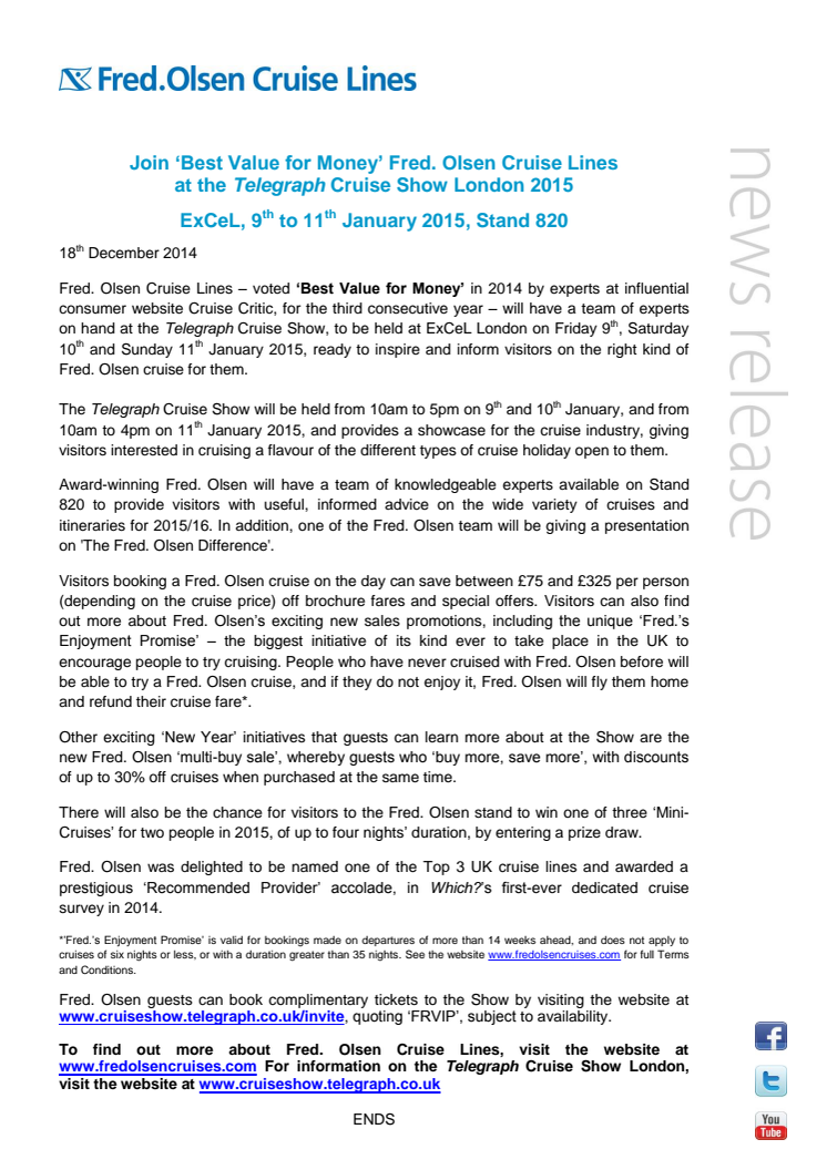 Join ‘Best Value for Money’ Fred. Olsen Cruise Lines at the Telegraph Cruise Show London 2015 | ExCeL, 9th to 11th January 2015, Stand 820