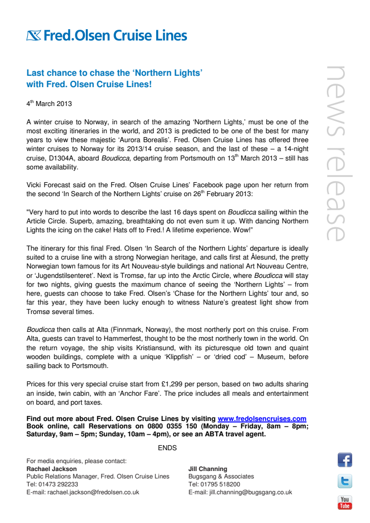Last chance to chase the ‘Northern Lights’ with Fred. Olsen Cruise Lines!