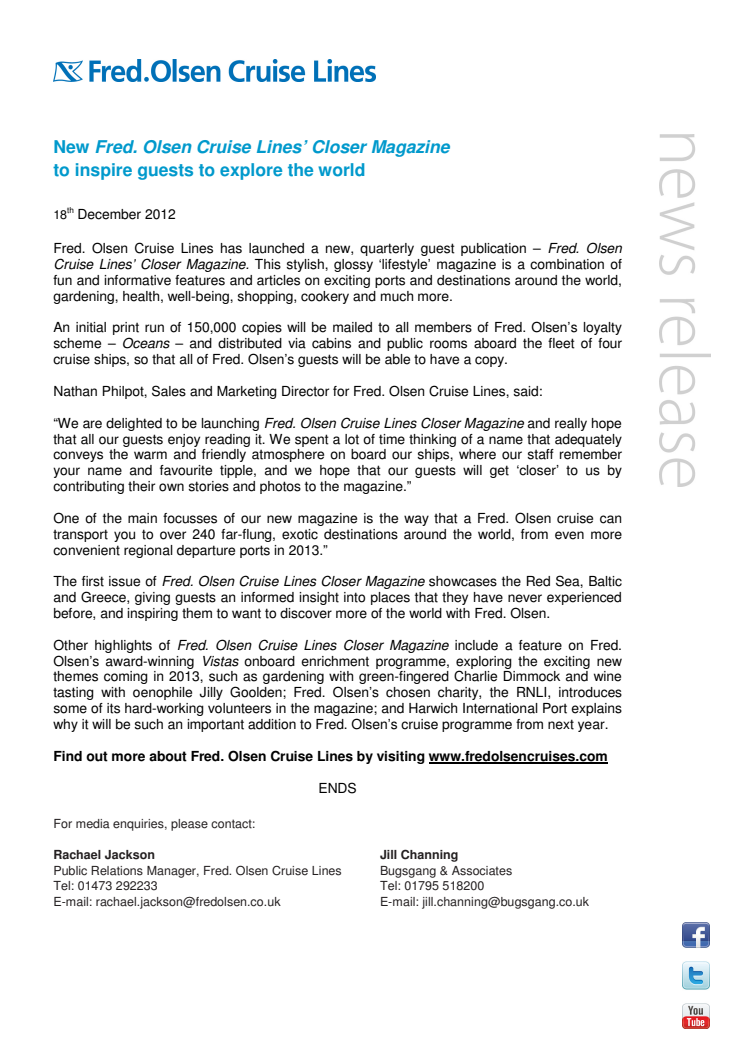 Fred. Olsen Cruise Lines has launched a new, quarterly guest publication – Fred. Olsen Cruise Lines’ Closer Magazine. This stylish, glossy ‘lifestyle’ magazine is a combination of fun and informative features and articles on exciting ports and destinations around the world, gardening, health, well-being, shopping, cookery and much more.