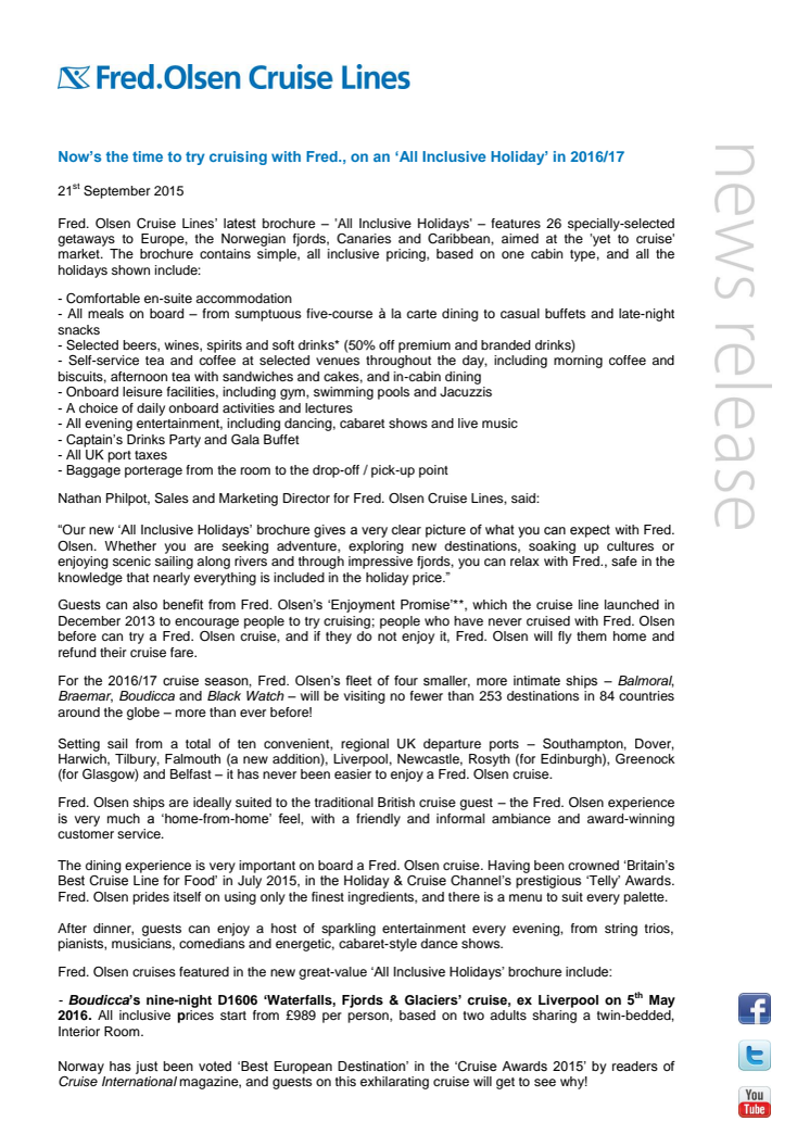 Fred. Olsen Cruise Lines’ latest brochure – 'All Inclusive Holidays' – features 26 specially-selected getaways to Europe, the Norwegian fjords, Canaries and Caribbean, aimed at the 'yet to cruise' market. The brochure contains simple, all-inclusive pricing, based on one cabin type.