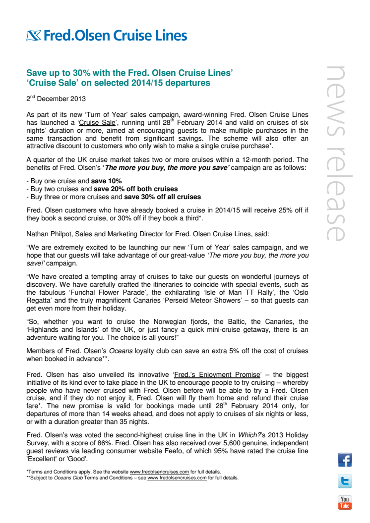 As part of its new ‘Turn of Year’ sales campaign, award-winning Fred. Olsen Cruise Lines has launched a ‘Cruise Sale’, running until 28th February 2014 and valid on cruises of six nights’ duration or more, aimed at encouraging guests to make multiple purchases in the same transaction and benefit from significant savings.