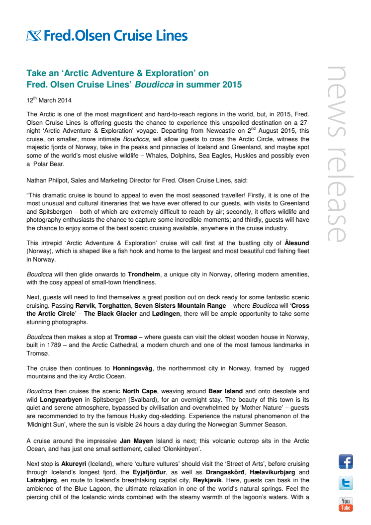 The Arctic is one of the most magnificent and hard-to-reach regions in the world, but, in 2015, Fred. Olsen Cruise Lines is offering guests the chance to experience this unspoiled destination on a 27-night ‘Arctic Adventure & Exploration’ voyage. Departing from Newcastle on 2nd August 2015, this cruise, on smaller, more intimate Boudicca, will allow guests to cross the Arctic Circle, witness...