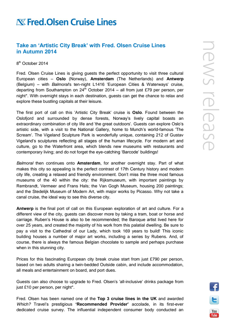 Fred. Olsen Cruise Lines is giving guests the perfect opportunity to visit three cultural European cities – Oslo (Norway), Amsterdam (The Netherlands) and Antwerp (Belgium) – with Balmoral's ten-night L1416 'European Cities & Waterways' cruise, departing from Southampton on 24th October 2014 – all from just £79 per person, per night*.