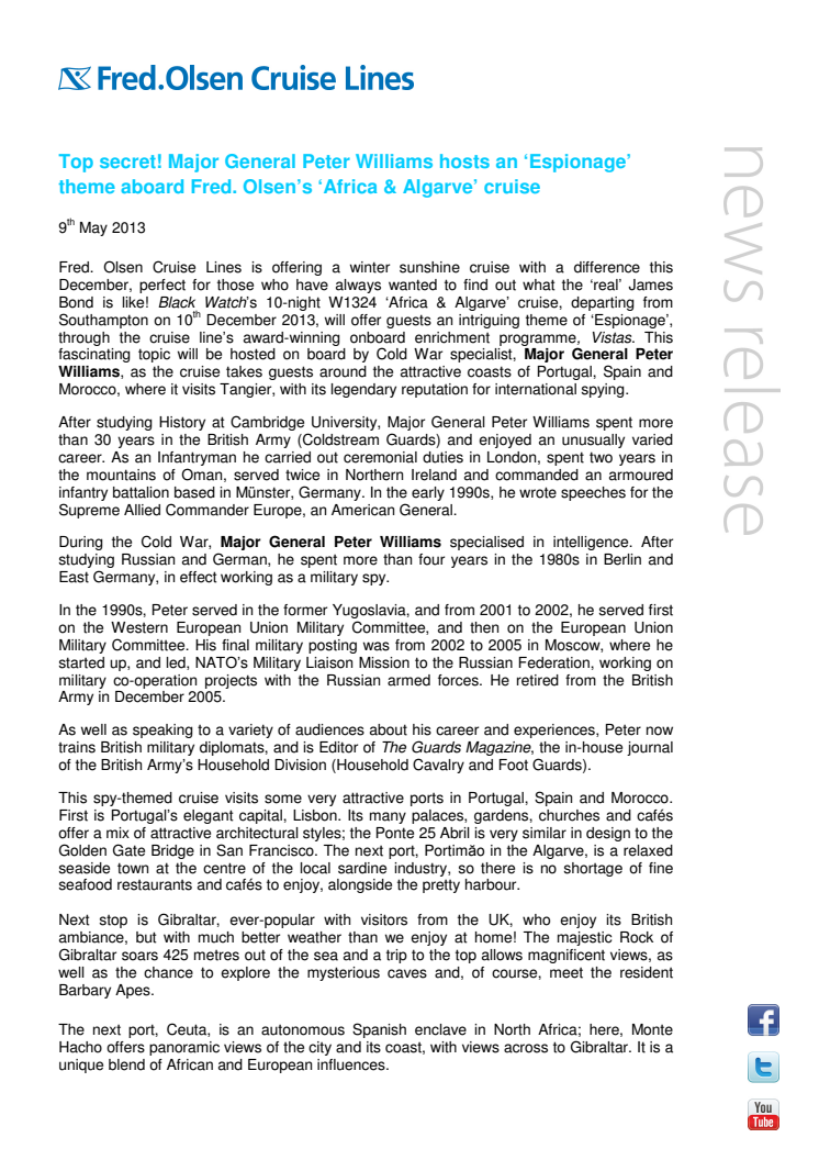 Top secret! Major General Peter Williams hosts an ‘Espionage’ theme aboard Fred. Olsen’s ‘Africa & Algarve’ cruise