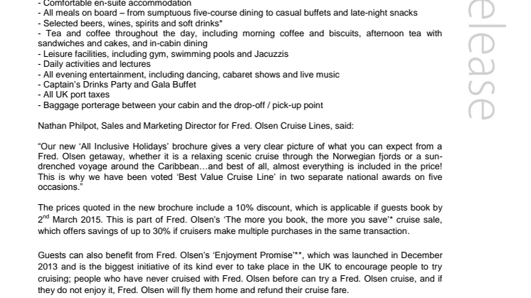 “Our new ‘All Inclusive Holidays’ brochure gives a very clear picture of what you can expect from a Fred. Olsen all inclusive cruise, whether it is a relaxing scenic cruise through the Norwegian fjords or a sun-drenched voyage around the Caribbean…and best of all, almost everything is included in the price! This is why we have been voted ‘Best Value Cruise Line’ in two separate national awards on five occasions.”