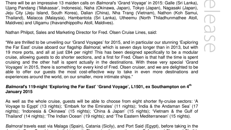 “We are thrilled to be unveiling our ‘Grand Voyages’ for 2015, and in particular our stunning ‘Exploring the Far East’ cruise aboard our flagship Balmoral, which is seven days longer than in 2013, but with 19 more ports, and all at just £84 per night! This has been designed specifically to be a modular cruise, allowing guests to do shorter sections, and a first for Fred. Olsen is that half the time is spent cruising and the other half is spent actually in the destinations. With these very special ‘Grand Voyages’ in 2015, there is something for every kind of Fred. Olsen cruiser, and we are delighted to be able to offer our guests the most cost-effective way to take in even more destinations and experiences around the world, on our smaller, more intimate ships.”