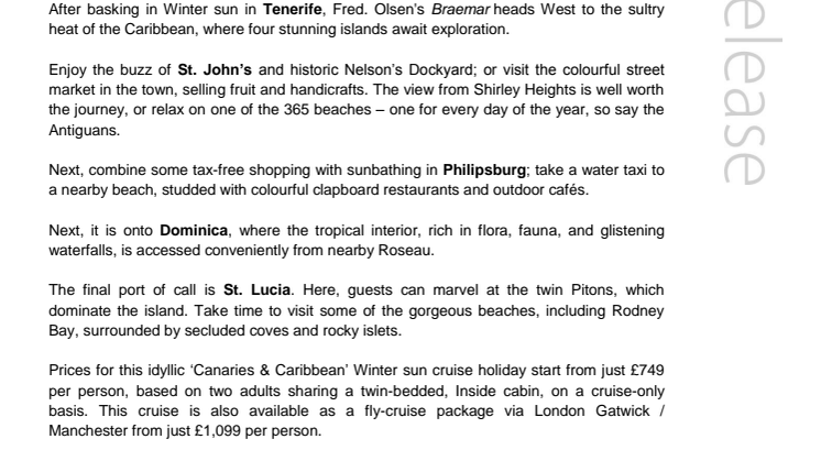 Enjoy a ‘Canaries New Year & the Caribbean’ Winter sun getaway with Fred. Olsen Cruise Lines in December 2014