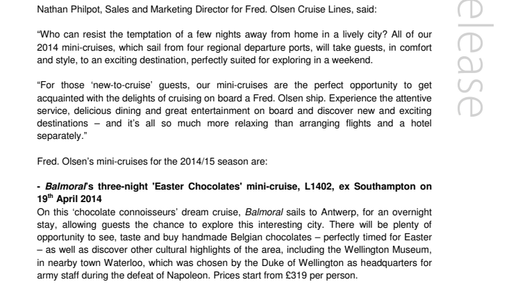 “Who can resist the temptation of a few nights away from home in a lively city? All of our 2014 mini-cruises, which sail from four regional departure ports, will take guests, in comfort and style, to an exciting destination, perfectly suited for exploring in a weekend.