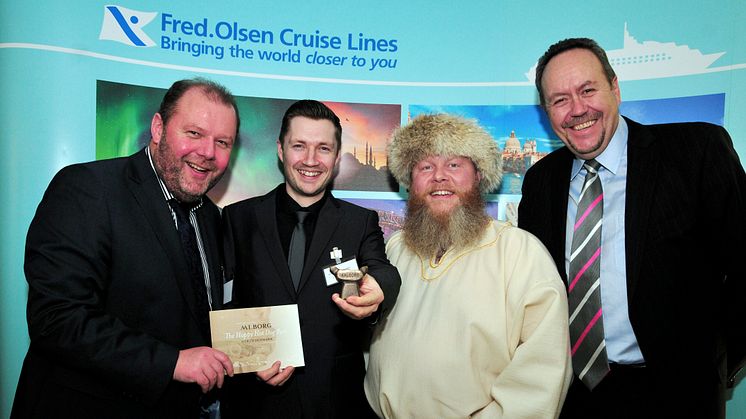 Fred. Olsen Cruise Lines’ Itinerary Planning Manager, Martin Lister (second from left), receives the first bronze ‘Aalborg Hotdog of Honour’, flanked by the Viking Chef, Jesper Lynge, Helge Søgaard of VisitAalborg (far right), and Cruise Manager at the Port of Aalborg, Lars Bech (far left), at the launch of Fred. Olsen’s new 2015/16 cruise programme in London on 4th March 2014.