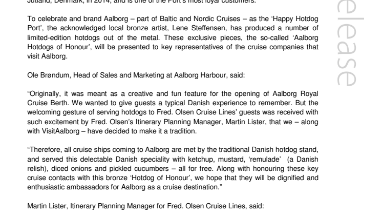 To celebrate and brand Aalborg – part of Baltic and Nordic Cruises – as the ‘Happy Hotdog Port’, the acknowledged local bronze artist, Lene Steffensen, has produced a number of limited-edition hotdogs out of the metal. These exclusive pieces, the so-called ‘Aalborg Hotdogs of Honour’, will be presented to key representatives of the cruise companies that visit Aalborg.