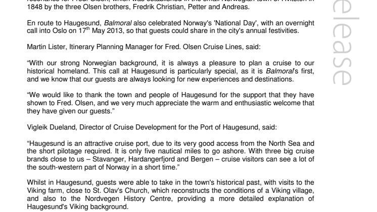 “We would like to thank the town and people of Haugesund for the support that they have shown to Fred. Olsen, and we very much appreciate the warm and enthusiastic welcome that they have given our guests.”