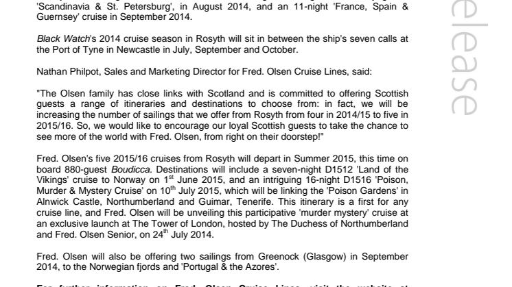 "The Olsen family has close links with Scotland and is committed to offering Scottish guests a range of itineraries and destinations to choose from: in fact, we will be increasing the number of sailings that we offer from Rosyth from four in 2014/15 to five in 2015/16. So, we would like to encourage our loyal Scottish guests to take the chance to see more of the world with Fred. Olsen, from right on their doorstep!"