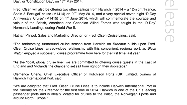 “We are delighted that Fred. Olsen Cruise Lines is to include Harwich International Port in the itinerary for the Braemar for the first time in 2014. Harwich is one of the UK’s leading passenger ports and is ideally located for cruises to the Baltic, the Norwegian Fjords and around North Europe.”