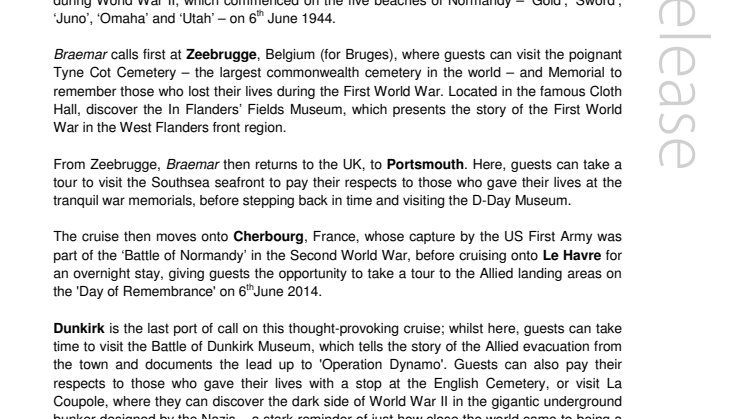 Those wishing to commemorate the 70th anniversary of ‘D-Day’ can join Fred. Olsen Cruise Lines’ Braemar on its seven-night M1415 cruise from Harwich, Essex on 1st June 2014. This cruise will give guests the chance to pay their respects to the courage and valour of the British, American and Canadian Allied Forces who fought in the ‘D-Day’ Normandy Landings during World War II, which commenced on the five beaches of Normandy – ‘Gold’, ‘Sword’, ‘Juno’, ‘Omaha’ and ‘Utah’ – on 6th June 1944.