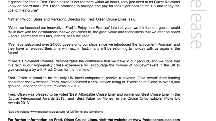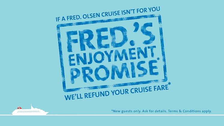 “‘Fred.’s Enjoyment Promise’ demonstrates the confidence that we have in our product, and we hope that this faith in our high-quality cruise experience will encourage the millions of holiday-makers in the UK to give cruising a try with Fred. Olsen for the first time.”