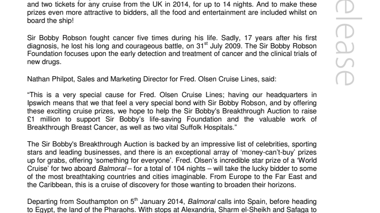 “This is a very special cause for Fred. Olsen Cruise Lines; having our headquarters in Ipswich means that we that feel a very special bond with Sir Bobby Robson, and by offering these exciting cruise prizes, we hope to help the Sir Bobby's Breakthrough Auction to raise £1 million to support Sir Bobby’s life-saving Foundation and the valuable work of Breakthrough Breast Cancer, as well as two vital Suffolk Hospitals.”