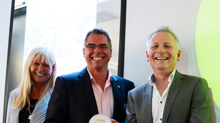 Nathan Philpot – Sales and Marketing Director for Fred. Olsen Cruise Lines is presented with the coveted ‘Best for Enrichment’ award by Julie Peasgood – Travel Writer and TV presenter and Andy Harmer – Director at CLIA UK & Ireland at the ‘Cruise International Awards 2014’.