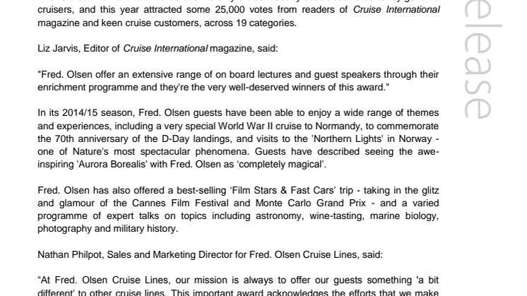 “At Fred. Olsen Cruise Lines, our mission is always to offer our guests something 'a bit different' to other cruise lines. This important award acknowledges the efforts that we make to give our loyal cruisers an enriched experience on their holiday, and not just the chance to get a sun tan.