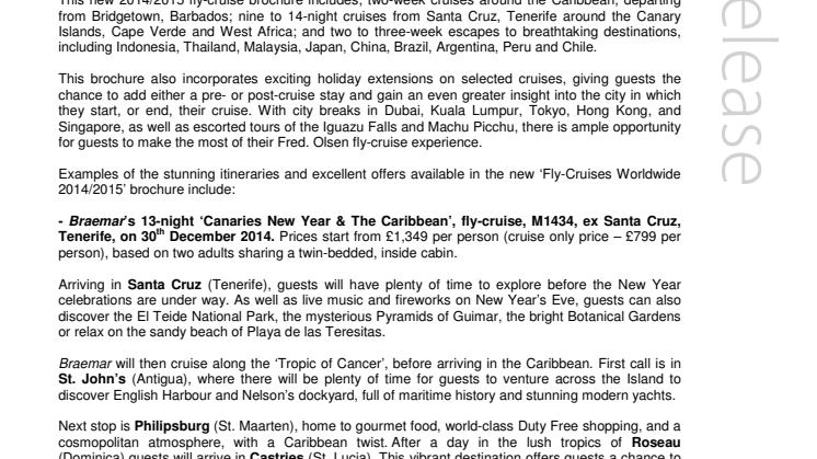 Fred. Olsen Cruise Lines has launched a new ‘Fly-Cruises Worldwide 2014/2015’ brochure, offering a host of tempting getaways to destinations far and wide, on board Balmoral, Braemar and Black Watch. These varied, exotic and sun-drenched fly-cruises, with prices starting from just £699 per person, can take guests straight to their chosen destination in a shorter time and importantly, for those guests having to book leave from work, using up fewer days’ holiday.