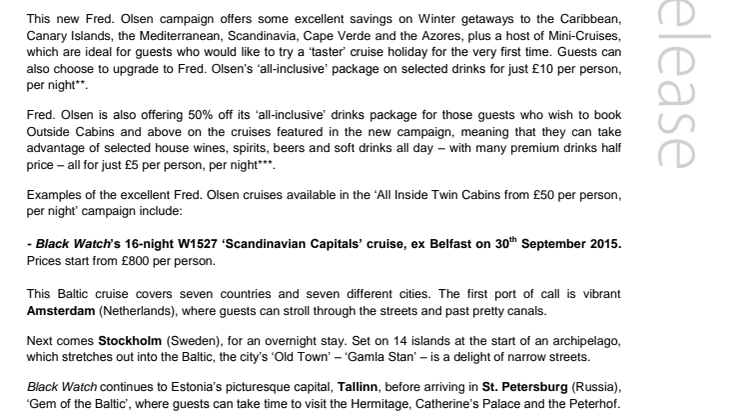 Fred. Olsen Cruise Lines has launched an exciting new promotional campaign – ‘All 2015 Inside Twin Cabins only £50 per person, per night’ – showcasing great-value deals on all Inside Twin cabins on selected cruises in 2015, which go on general sale from 15th September 2015*. These attractive offers will be available on departures between 30th September 2015 – with Black Watch’s 16-night W1527 ‘Scandinavian Capitals’ cruise, ex Belfast – and 18th December 2015 – with Black Watch’s two-night W1524 ‘Dublin Mini-Cruise’, ex Liverpool.