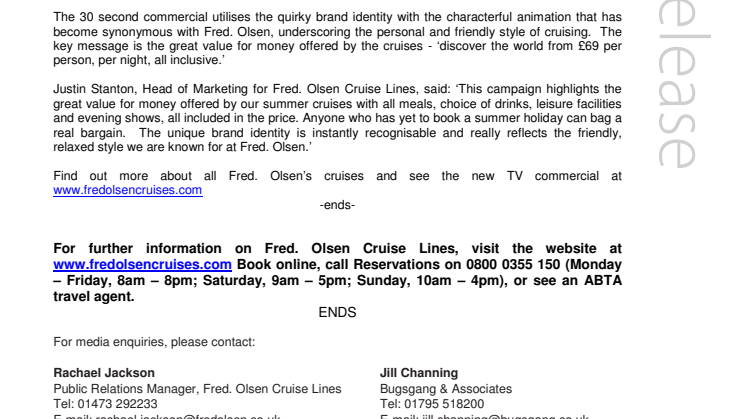 Justin Stanton, Head of Marketing for Fred. Olsen Cruise Lines, said: ‘This campaign highlights the great value for money offered by our summer cruises with all meals, choice of drinks, leisure facilities and evening shows, all included in the price. Anyone who has yet to book a summer holiday can bag a real bargain. The unique brand identity is instantly recognisable and really reflects the friendly, relaxed style we are known for at Fred. Olsen.’