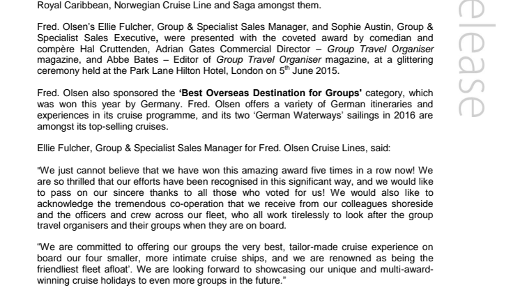 Fred. Olsen’s Ellie Fulcher, Group & Specialist Sales Manager, and Sophie Austin, Group & Specialist Sales Executive, were presented with the coveted award by comedian and compère Hal Cruttenden, Adrian Gates Commercial Director – Group Travel Organiser magazine, and Abbe Bates – Editor of Group Travel Organiser magazine, at a glittering ceremony held at the Park Lane Hilton Hotel, London on 5th June 2015.