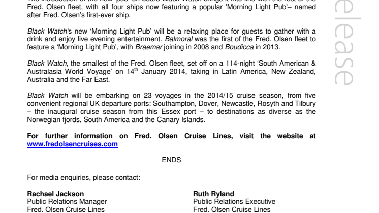 The introduction of the new ‘pub’ on board Black Watch brings it into line with the rest of the Fred. Olsen fleet, with all four ships now featuring a popular 'Morning Light Pub'– named after Fred. Olsen’s first-ever ship.