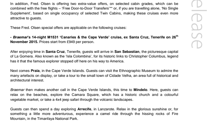 Fred. Olsen Cruise Lines is offering guests free flights* on two Canaries Winter sunshine fly-cruises from London Gatwick and Manchester airports, if they book by 31st August 2015 inclusive. Setting sail from Santa Cruz in Tenerife aboard Braemar, guests can choose a 14-night M1531 ‘Canaries & Cape Verde’ cruise, departing on 26th November 2015, or a 13-night ‘Canaries Collection’ sailing, departing on 10th December 2015.