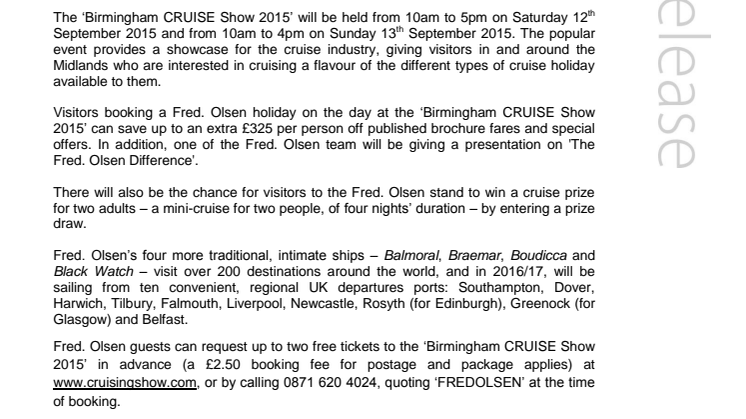 Fred. Olsen guests can request up to two free tickets to the ‘Birmingham CRUISE Show 2015’ in advance (a £2.50 booking fee for postage and package applies) at www.cruisingshow.com, or by calling 0871 620 4024, quoting ‘FREDOLSEN’ at the time of booking.