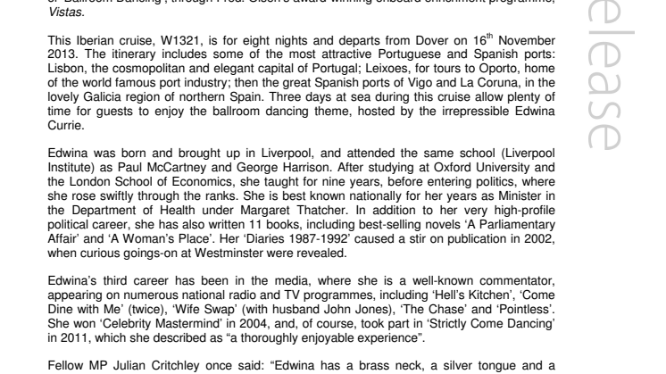 The popular writer, broadcaster, and former MP, Edwina Currie, will be joining a Fred. Olsen Cruise Lines’ ‘Spain and Portugal’ cruise aboard Black Watch in 2013, with the very topical theme of ‘Ballroom Dancing’, through Fred. Olsen’s award-winning on board enrichment programme, Vistas.