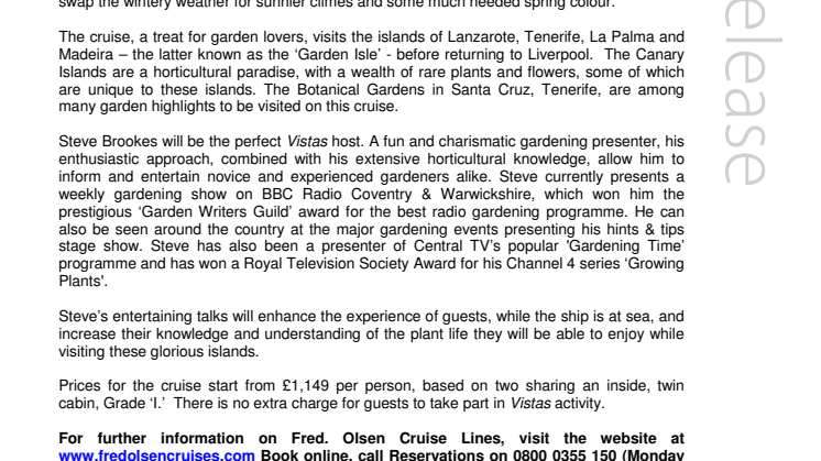 Last Chance to make a Spring getaway! Join BBC Gardening Expert, Steve Brookes, on a Fred. Olsen Vistas Cruise to the Canaries