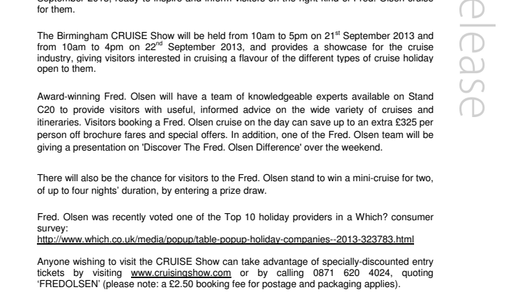 Learn all about the ‘Fred. Olsen Cruise Lines’ difference’ at the Birmingham Telegraph CRUISE Show 2013