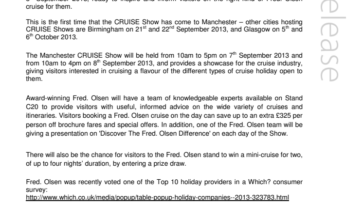 Learn all about the ‘Fred. Olsen Cruise Lines’ difference’ at the Manchester Telegraph CRUISE Show 2013