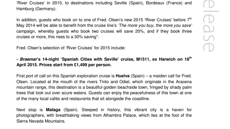 In addition, guests who book on to one of Fred. Olsen’s new 2015 ‘River Cruises’ before 7th May 2014 will be able to benefit from the cruise line’s ‘The more you buy, the more you save’ campaign, whereby guests who book two cruises will save 20%, and if they book three cruises or more, this rises to a 30% saving*.