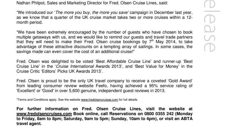 “We have been extremely encouraged by the number of guests who have chosen to book multiple getaways with us, and we would like to remind our guests and travel trade partners that they will need to make their Fred. Olsen cruise bookings by 7th May 2014, to take advantage of these attractive discounts on a tempting array of sailings. In some cases, the savings made can even cover the cost of an additional cruise!”