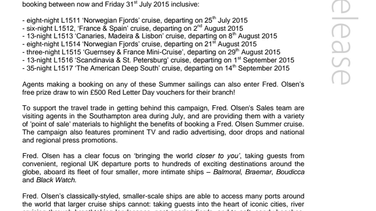 To support the travel trade in getting behind this campaign, Fred. Olsen's Sales team are visiting agents in the Southampton area during July, and are providing them with a variety of 'point of sale' materials to highlight the benefits of booking a Fred. Olsen Summer cruise. The campaign also features prominent TV and radio advertising, door drops and national and regional press promotions.