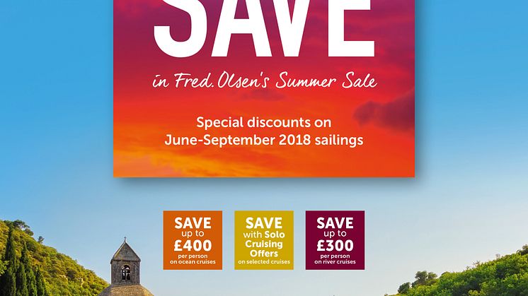 ​Fred. Olsen is offering guests attractive savings on over 40 ocean and river sailings from June to September 2018, in its new ‘Summer Sale 2018’, on all new bookings made from 11th April to 2nd July 2018 inclusive. Guests can save up £400 per person on ocean cruises, and up to £300 per person on 'Brabant' river cruises. Special solo cruising offers are also available on selected sailings.